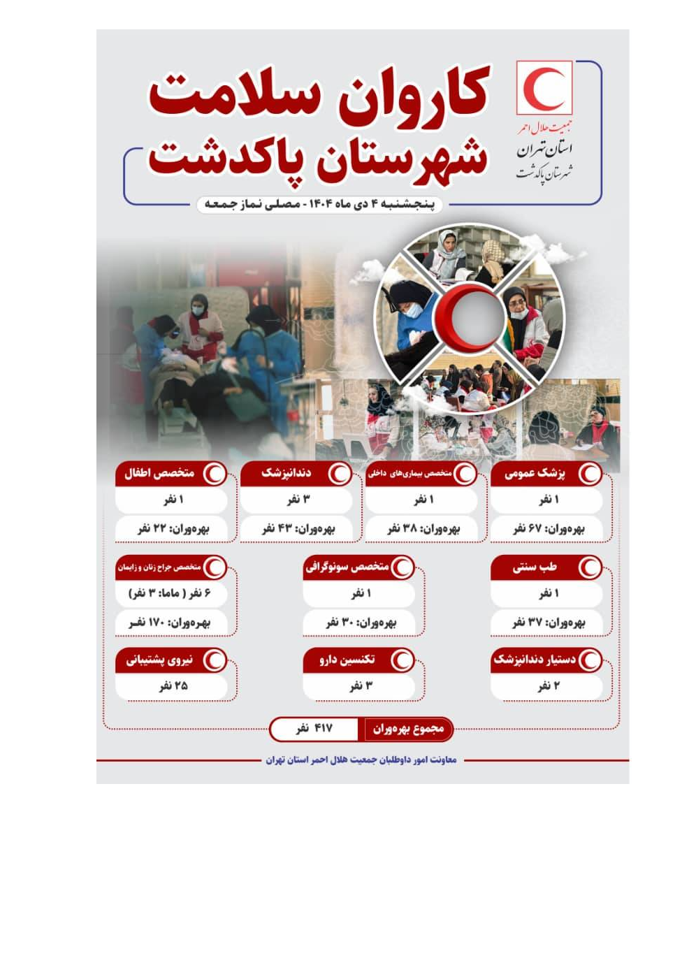 به گزارش روابط عمومی جمعیت هلالاحمر استان تهران؛صبح روز پنجشنبه ۶ دیماه ۱۴۰۴، کاروان سلامت جمعیت هلالاحمر استان تهران با استقرار در شهرستان پاکدشت، به ۴١٧ نفر از شهروندان خدمات رایگان درمانی و بهداشتی ارائه داد.